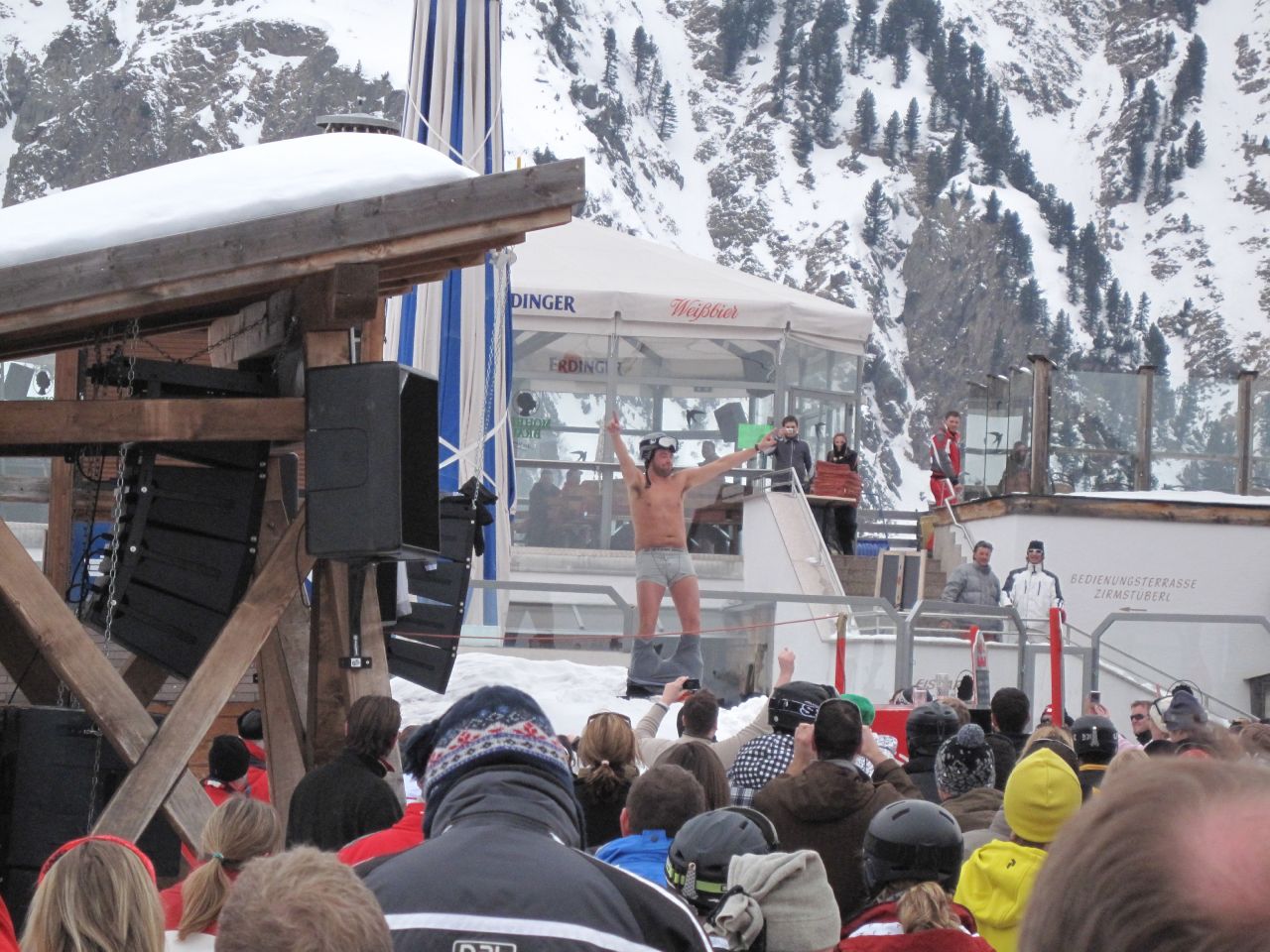 Und nun ein Leckerbissen für alle Damen! In der Paznauner Taja beim Aprés-Ski geschah es, dass ein Typ sich bei einem Strip praktisch vollständig auszog und seine Hüllen fallen liess!