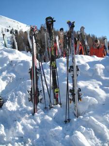 Auf den folgenden Fotos kann man gut sehen, was für Skis so in Ischgl gefahren werden. Nur das Beste ist natürlich gut genug. Und nun müssen sie draussen stehen, während sich deren Besitzer im Kuhstall die Lampen füllen.